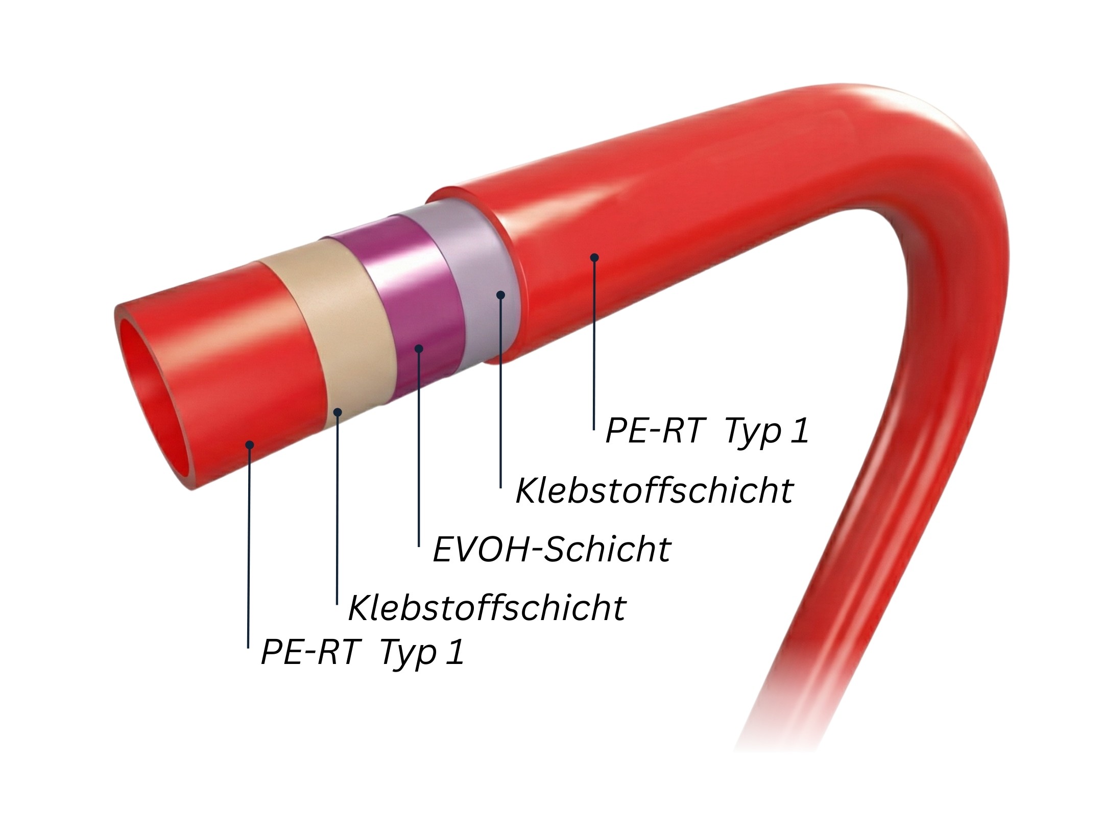 5-Schicht PE-RT Heizrohr mit EVOH-Sauerstoffsperrschicht nach DIN 4726, ausgelegt für Fußbodenheizungen und diffusionsdicht. Hergestellt von einem deutschen Hersteller.